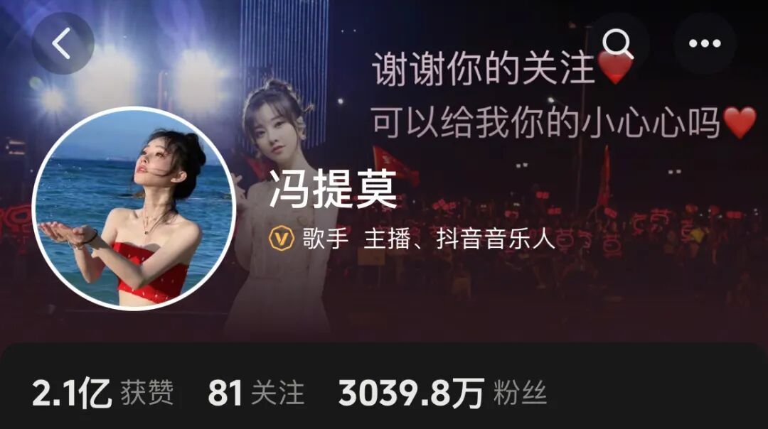 九派新闻搜索发现,冯提莫抖音账号粉丝超3039万,微博账号粉丝超1001万。