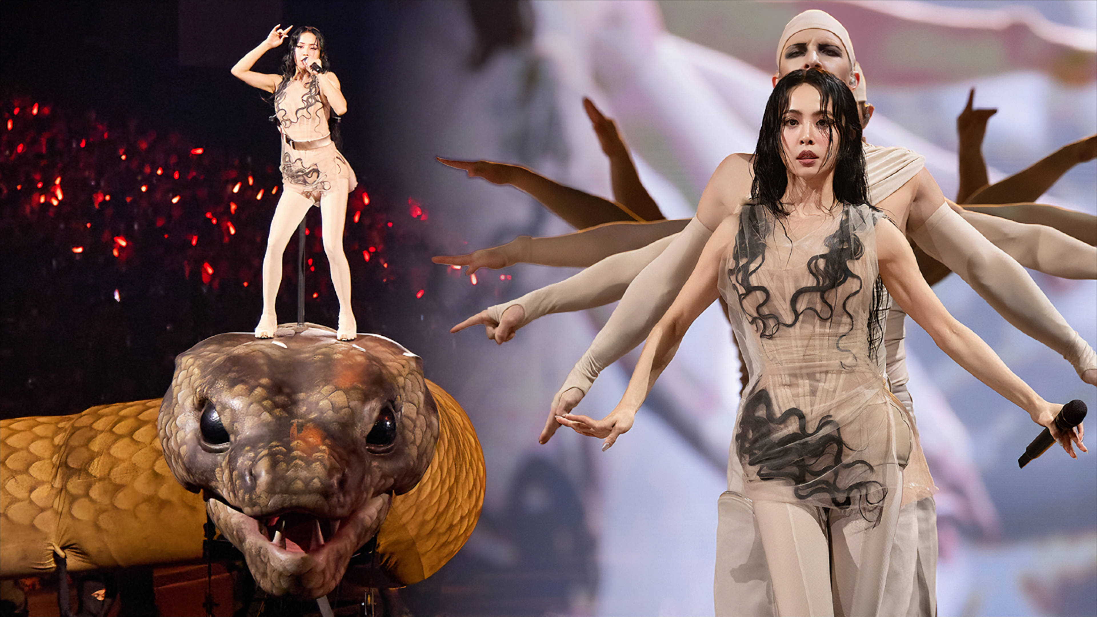 砸2亿人民币打造的「人间乐园」,到底有多能打?除了那条出圈的机械蛇,舞台上还藏着不少黑科技彩蛋。360度全景互动设计让每个座位都是VIP,你坐着不动,舞台会主动「找上门」——巨型金色公牛装置从观众席后方突袭,全息投影把整个场馆变成流动的油画,连无人机群都来凑热闹,在空中组成闪烁的星座图案。最绝的是蔡依林在蛇背上的6分30秒唱跳,全程无防护还能零失误,网友调侃:「这哪里是演唱会,分明是好莱坞级别的实景秀!」